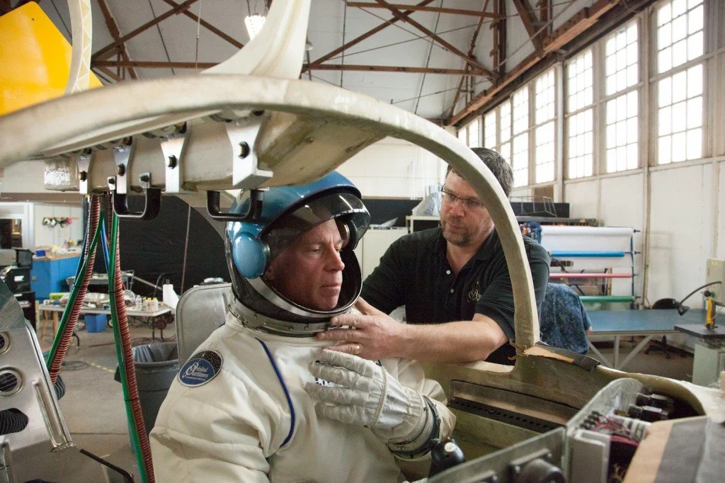 XCOR Chief Test Pilot and former NASA Astronaut Rick Searfoss sits in a full-scale Lynx cabin mockup to test a prototype helmet and suit with Orbital Outfitters Chief Designer Chris Gilman.
