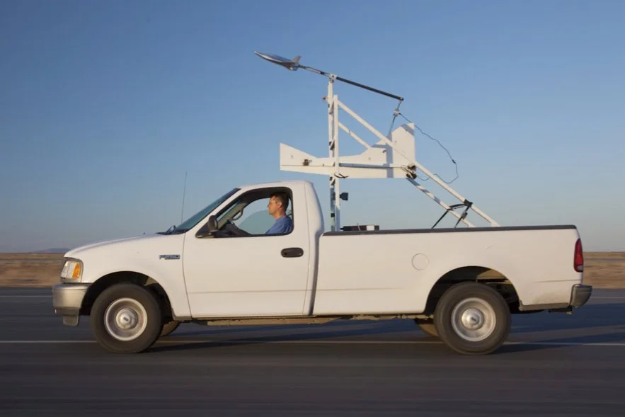 In 2009 XCOR built a highly precise sub-sonic wind tunnel test model of the Lynx. For some preliminary data before actual wind tunnel visits, we ran tests using our ‘DIY truck tunnel’ as shown above. The truck and its fixtures include precisely instrumented appendages, structures and bit of computing and data recording capability. We also used the truck tunnel after the sub-sonic wind tunnel tests to experiment with some additional design features before returning to the real tunnel a second time.