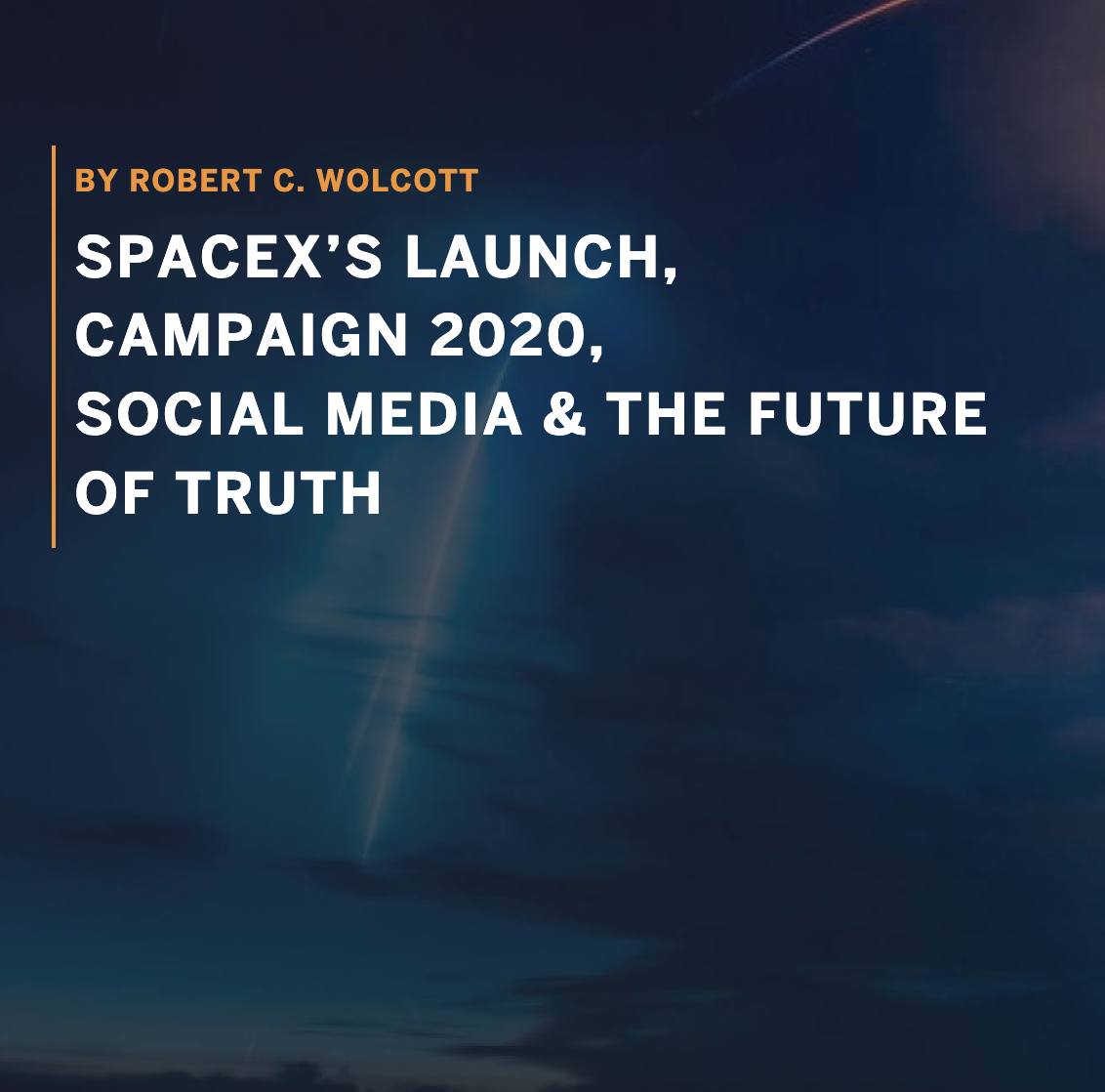 Here is an article I co-authored with TWIN founder and executive director Rob Wolcott for Forbes titled SpaceX’s Launch, Campaign 2020, Social Media & the Future of Truth.